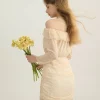 Style: Honey colored off-the-shoulder mini dress, wonderfully elegant and feminine look