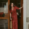 Design: Surrounds the hem and secures with a side knot. Short puff sleeves and floral V-neckline
