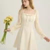 Style: Short dress with ribbon Great elegant and feminine design Hidden back zipper; square neckline; Long sleeves with 100% polyester elastic cuffs for lining