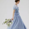 Design: Puff-sleeved shirt with ruffled waist, moderately flared skirt, two flowing layers